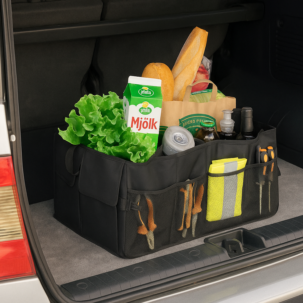 Med den här hopfällbara förvaringslådan från spanska kvalitétsmärket InnovaGoods så slipper han kaoset. Tre rymliga fack och flera smarta fickor håller ordning på allt från vattenflaskor och förbandslåda till småprylar som annars gömmer sig längst in. Den står stadigt med kardborreband i botten, är lätt att bära ut med sina handtag och kan fällas ihop när den inte behövs. Perfekt för långresor, veckohandling eller bara för att en gång för alla tämja bagageutrymmet.