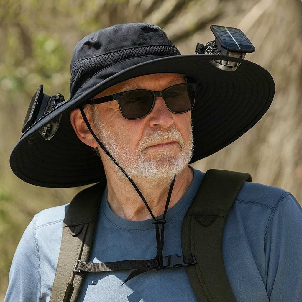 Fläkthatten Robert - Sollcellsdriven fläkt i skärmen och starkt solskydd (SPF + 50)